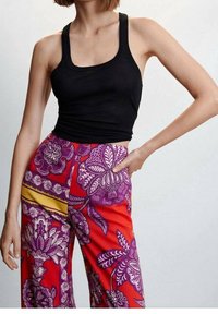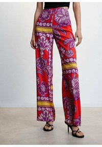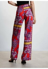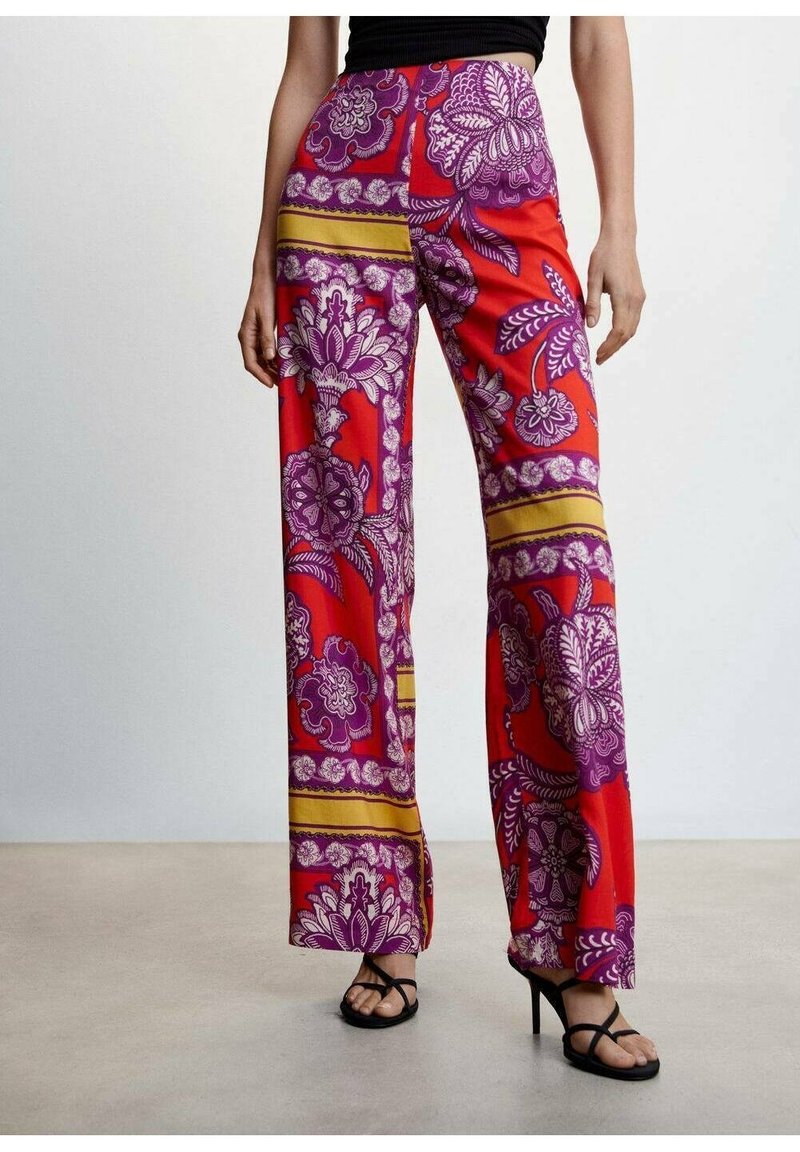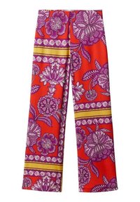 Pantalon large à motifs rouges avec des dessins floraux violets et des rayures dorées. Confectionné en tissu lisse, souligné par une taille haute et des poches latérales.