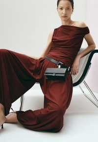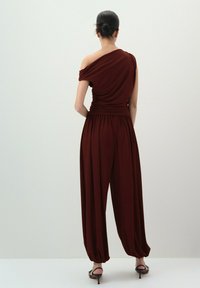 Femme avec les cheveux en chignon portant un haut bordeaux à une épaule et un pantalon ample taille haute assorti avec des ourlets froncés, debout de dos.