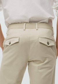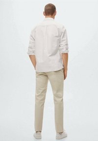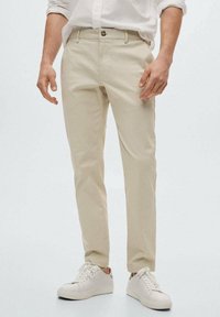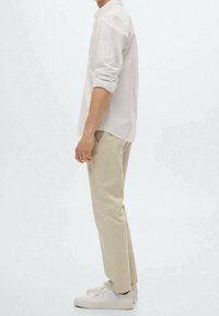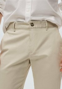 Pantalon beige en coton coupe slim, doté d'une fermeture à bouton, de poches latérales et d'ourlets retroussés. Associé à des baskets blanches.