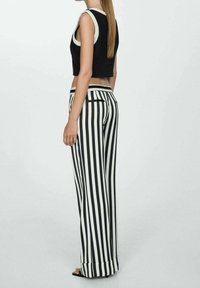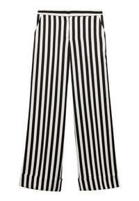 Pantalon à jambes larges à rayures noires et blanches avec une texture lisse, une taille ajustée et une légère brillance. Présente des ouvertures de jambes longues et droites.