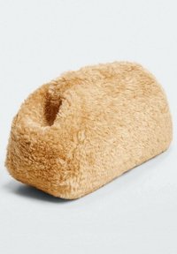 Pochette rectangulaire en fausse fourrure beige avec une texture douce et duveteuse et une forme structurée.
