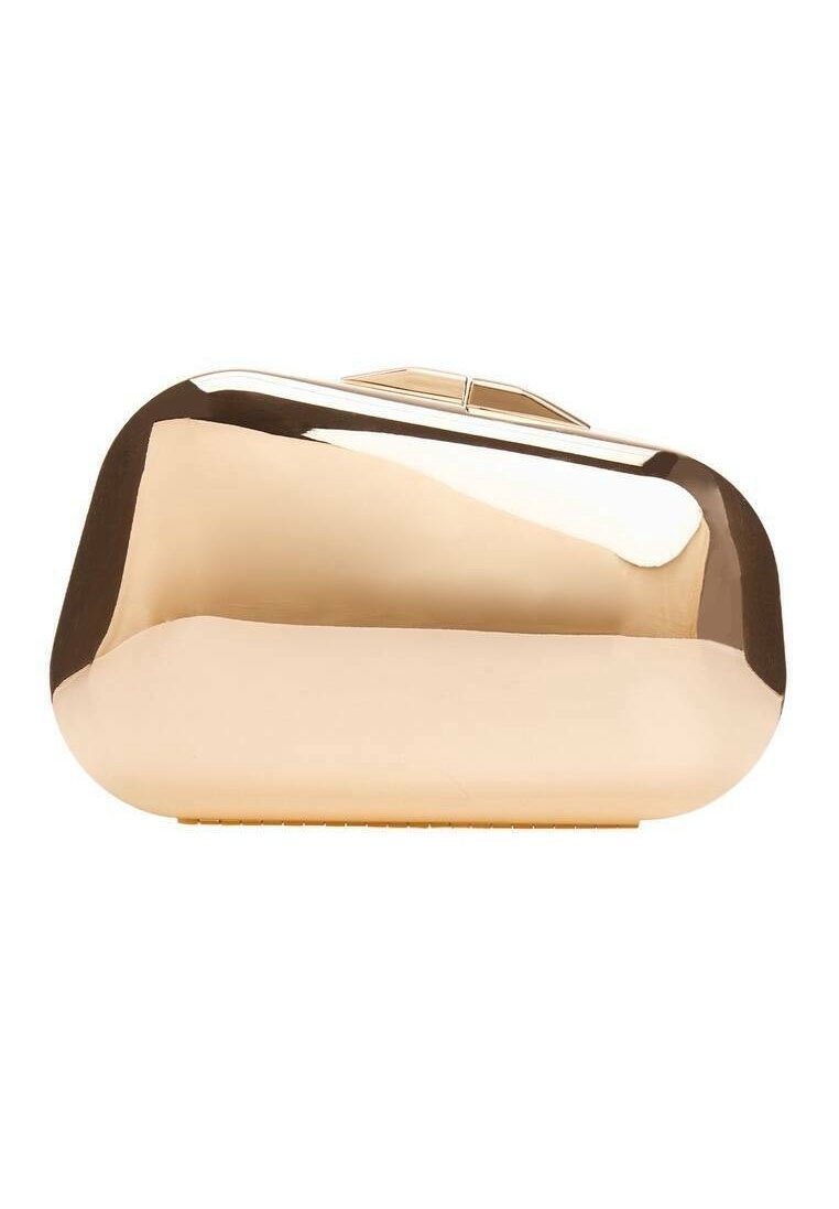 Pochette en or métallique avec un design lisse, arrondi et un fond plat. Elle possède une fermeture à boucle et des accents texturés sur les côtés.