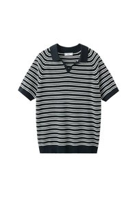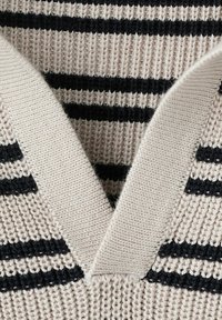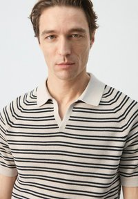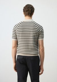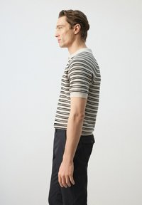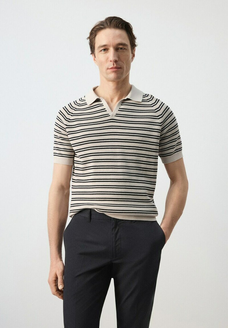 Homme portant un polo beige à manches courtes avec des rayures horizontales noires et un pantalon foncé, debout avec une main dans la poche.