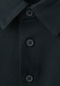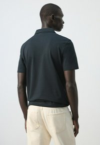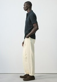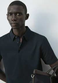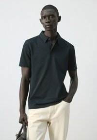 Homme portant un polo noir à manches courtes et un pantalon beige, tenant un sac noir dans une main, debout devant un fond clair uni.