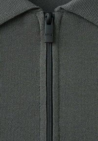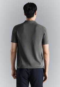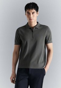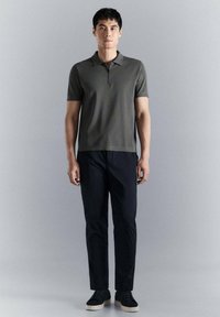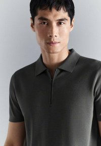 Homme portant un polo à manches courtes vert foncé avec une fermeture éclair à l'avant et un pantalon noir, debout devant un fond gris clair.