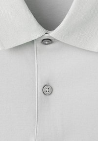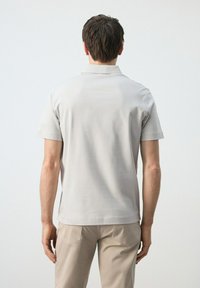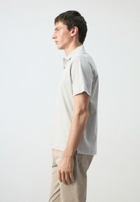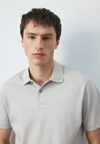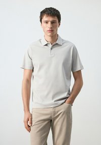 Jeune homme debout portant un polo à manches courtes gris clair et un pantalon beige, une main dans la poche, devant un fond uni.