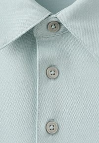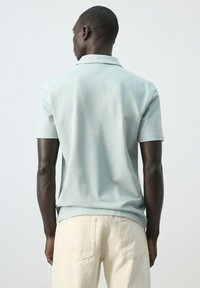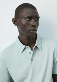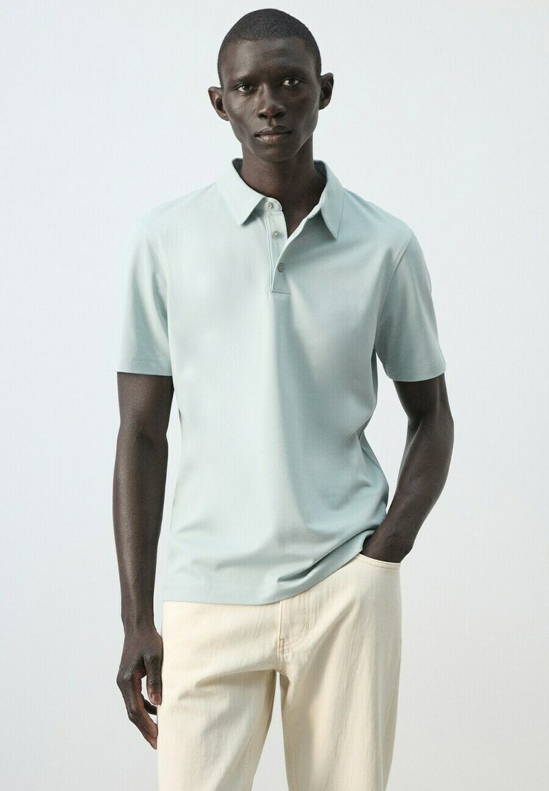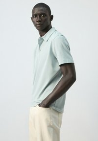 Homme portant un polo à manches courtes bleu clair et un pantalon crème, debout avec une main dans la poche devant un fond uni.