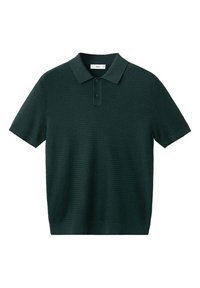 Homme debout, mains dans les poches, portant un polo blanc texturé à manches courtes et un pantalon vert foncé à cordon, sur un fond uni.