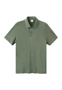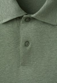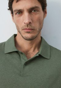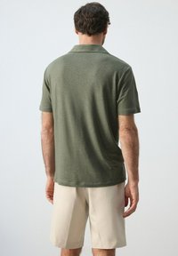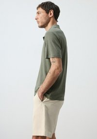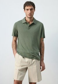 Homme aux cheveux courts et foncés portant un polo manches courtes vert olive et un short beige jusqu'aux genoux, debout les mains dans les poches.