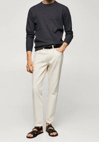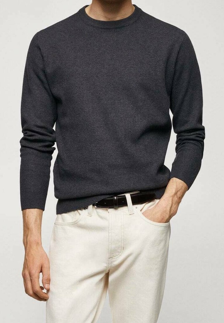Homme portant un pull en maille gris foncé et un pantalon blanc cassé avec une ceinture noire, posant avec une main dans la poche.