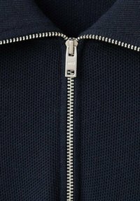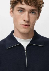 Pull-over zippé bleu marine en tissu maille texturé, avec col polo et manches bord-côtes. Associé à un pantalon de couleur claire.