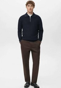 Pull-over en maille bleu marine avec col zippé, manches longues et tissu texturé. Porté sur une chemise blanche, associé à un pantalon marron.