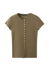 Femme portant un haut vert olive à manches courtes et boutonné, un pantalon noir ample et des sandales noires, debout les mains dans les poches sur fond blanc.
