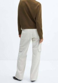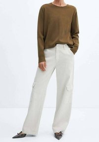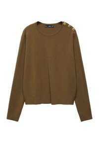 Pull vert olive à encolure ronde et manches longues. Présente des accents de boutons dorés sur l'épaule, associé à un pantalon blanc.