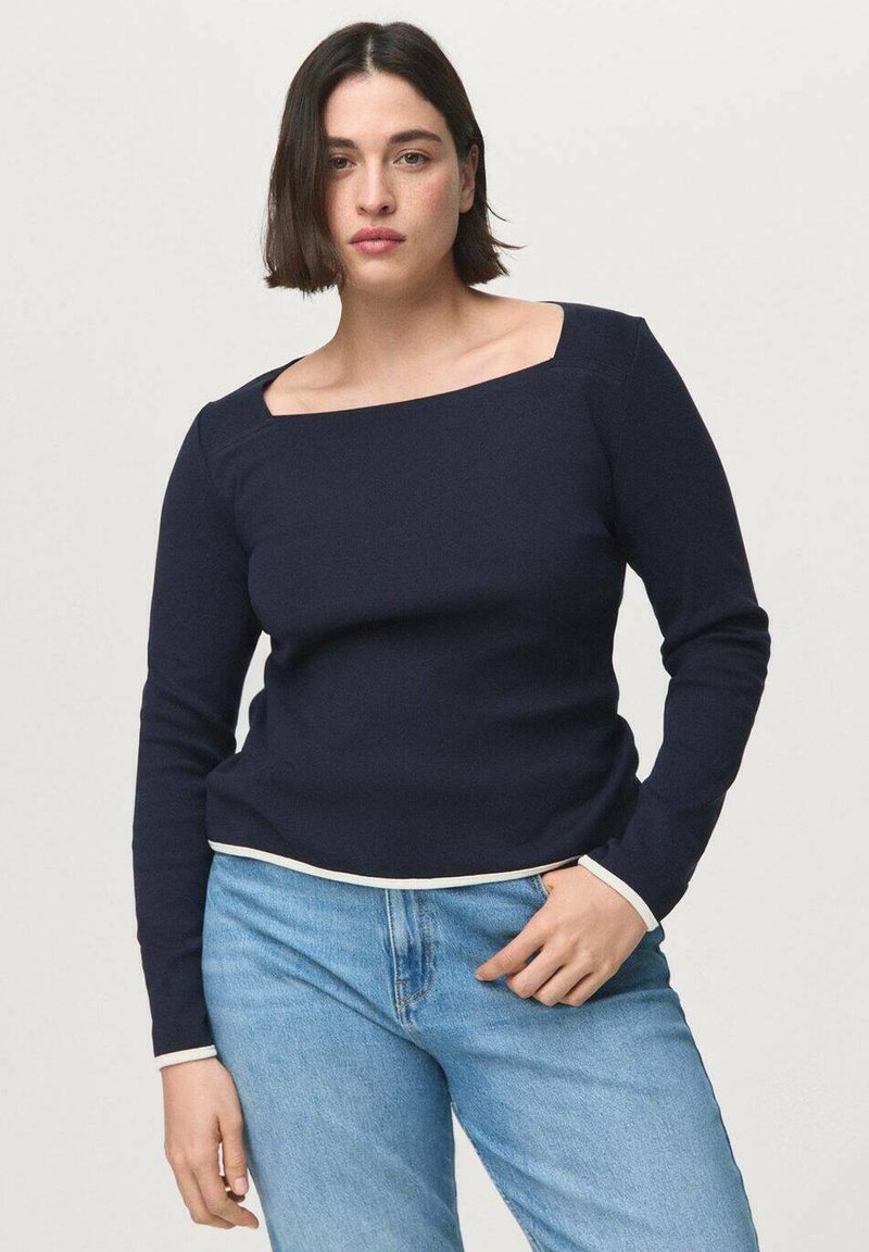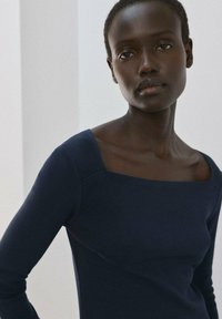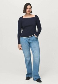 Femme aux cheveux courts et foncés, portant un haut bleu marine à manches longues avec un décolleté asymétrique et un jean bleu clair, debout devant un fond uni.