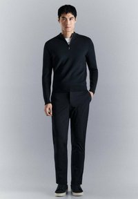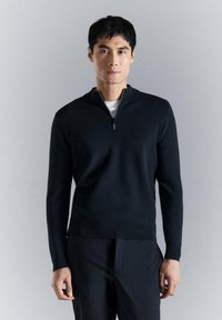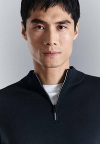 Jeune homme portant un pull noir à manches longues avec une fermeture éclair quart de tour sur une chemise blanche, debout devant un fond gris clair uni.
