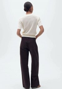 Haut léger en coton côtelé crème associé à un jean marron foncé, taille haute et jambes larges. Accessoires comprenant un sac à main à motif et des bracelets minimalistes.