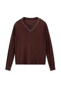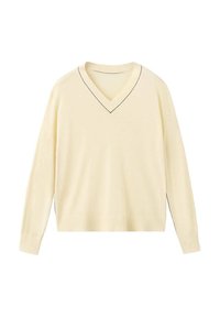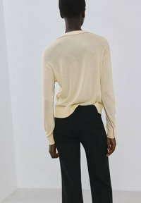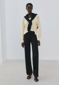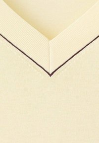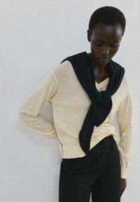 Pull en maille jaune clair avec un col en V et des accents noirs, drapé d'une écharpe noire, associé à un pantalon noir ; texture lisse et coupe ajustée.
