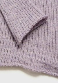 Femme portant un pull à capuche en maille côtelée violet clair à manches longues et un short noir taille haute, les bras croisés.