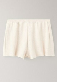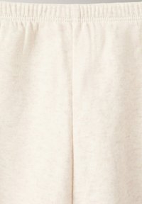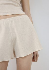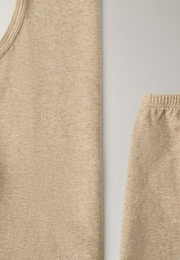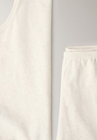 Jeune femme aux longs cheveux ondulés portant un haut beige sans manches, un short ample assorti et des sandales plates, debout devant un fond clair uni.