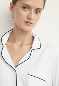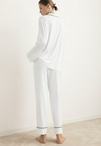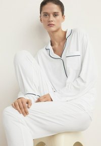 Femme aux cheveux retenus, portant un haut de pyjama blanc à manches longues avec des liserés noirs et un pantalon de pyjama blanc assorti, debout de profil.