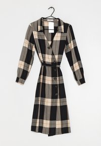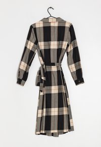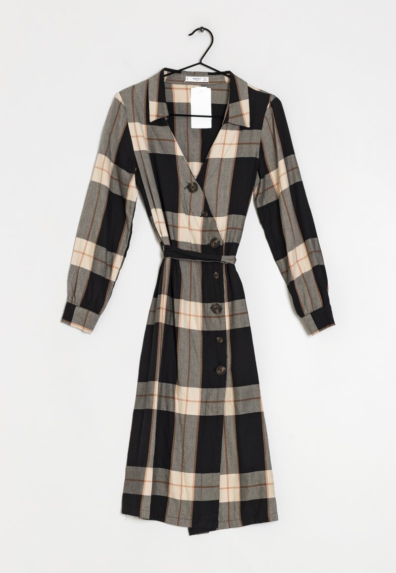 Robe à manches longues, à carreaux noirs avec des carrés beiges et gris ; présente un col, des boutons et une ceinture assortie à la taille.