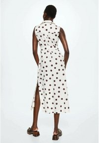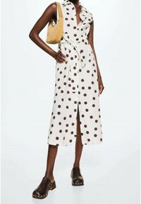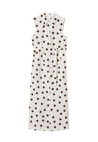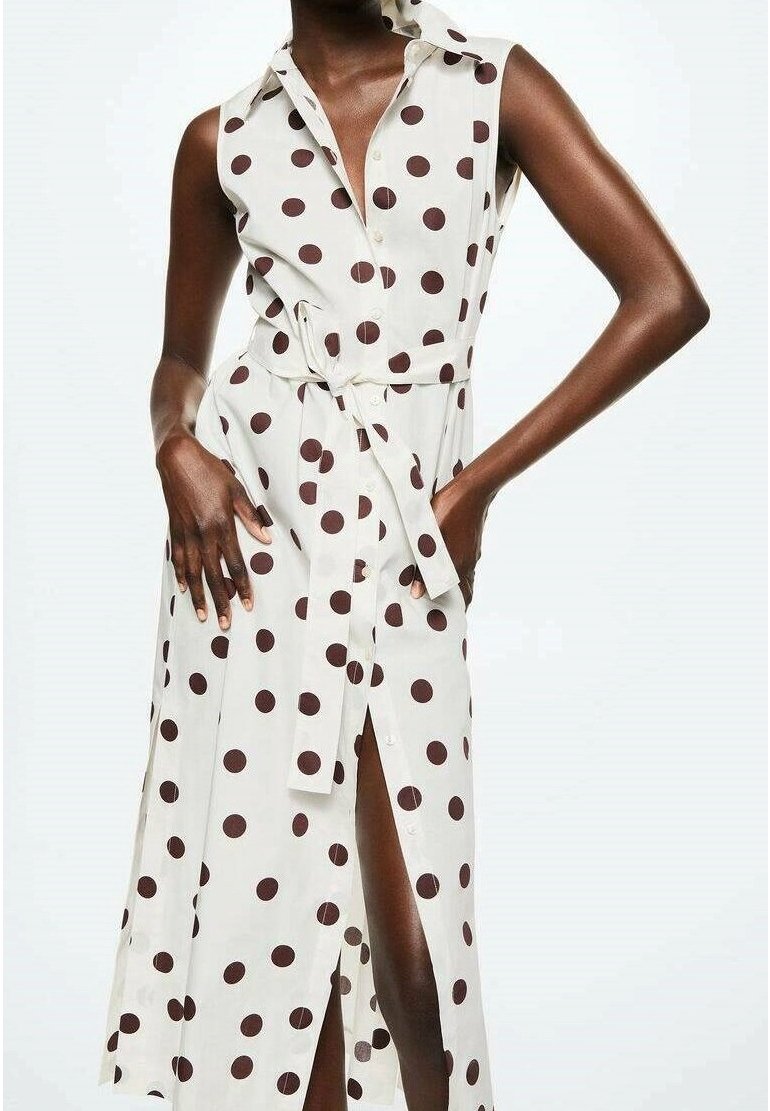 Robe blanche à manches courtes avec de grands pois marron, ceinture à la taille ; présente une fente jusqu'à la cuisse. Tissu au toucher lisse.