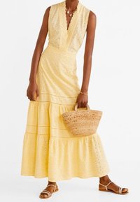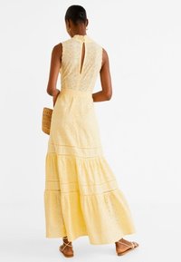 Robe maxi sans manches jaune avec un décolleté en V, en tissu à œillets, avec des volants superposés au niveau de l'ourlet et des bords festonnés le long du col.
