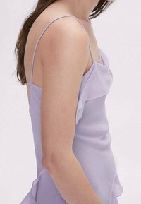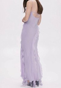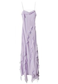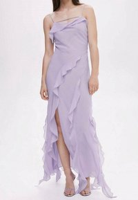 Robe en chiffon lilas avec détails à volants, ourlet asymétrique et fente haute sur la cuisse ; dotée de fines bretelles spaghetti et d'un corsage ajusté.