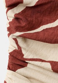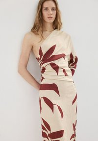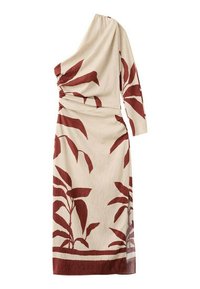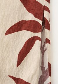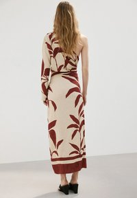 Femme aux longs cheveux portant une robe longue asymétrique crème et rouille à motifs de feuilles, avec des talons compensés noirs, debout de dos.