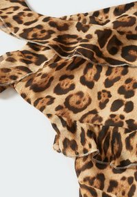Robe en imprimé léopard, à une épaule, avec des couches ondulées et une fente haute. Fabriquée en tissu léger, avec un bas fluide et transparent.