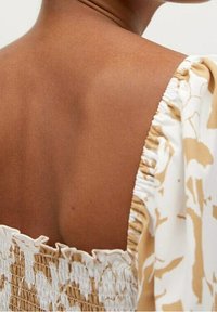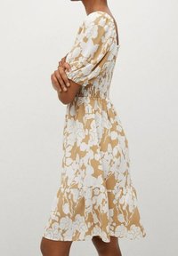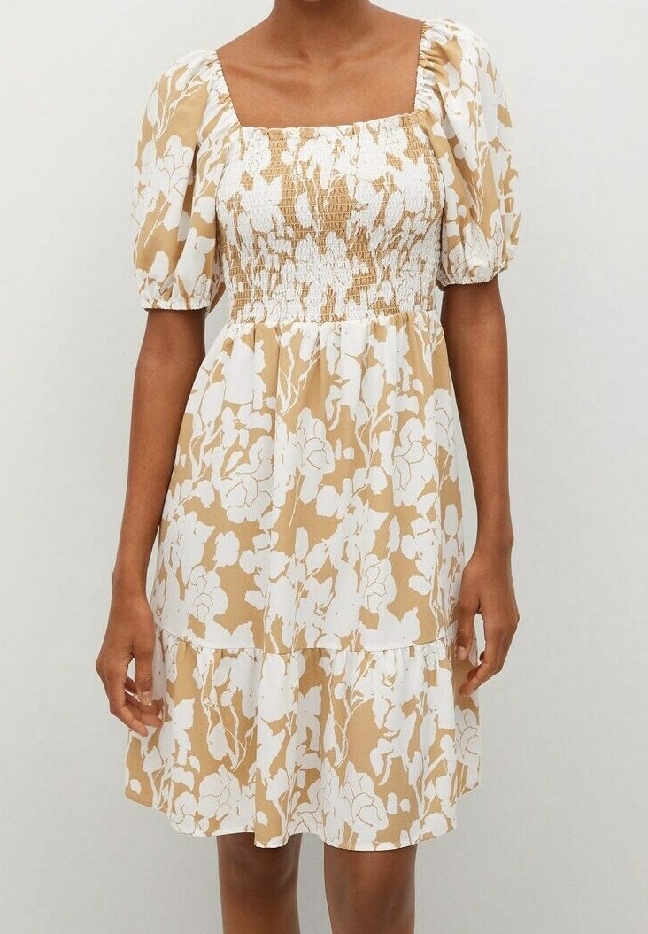 Robe florale avec un décolleté carré, des manches bouffantes, un corsage smocké, un motif beige et blanc, et une jupe à volants. Tissu léger avec une texture fluide.