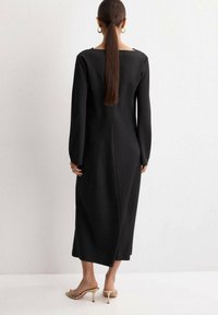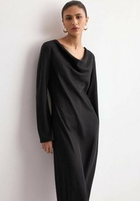 Robe noire à manches longues avec un col bateau, en tissu lisse, présentant une coupe décontractée et une longueur jusqu'aux chevilles, associée à des talons dorés.
