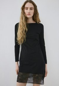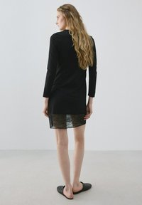 Robe noire avec de longues manches transparentes, un col rond et un corps ajusté. Texture lisse, design jusqu'aux genoux, style minimaliste.