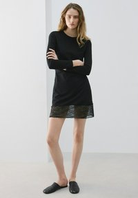 Femme portant une robe noire en dentelle à manches longues avec un col arrondi, debout devant un fond blanc uni, faisant face à l'avant.