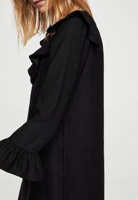 Robe noire avec un col en V à volants et des manches cloche, en tissu lisse. Le design présente une coupe droite et ample.