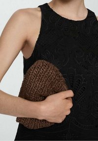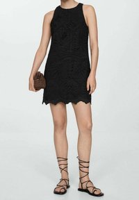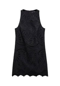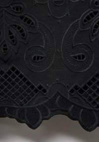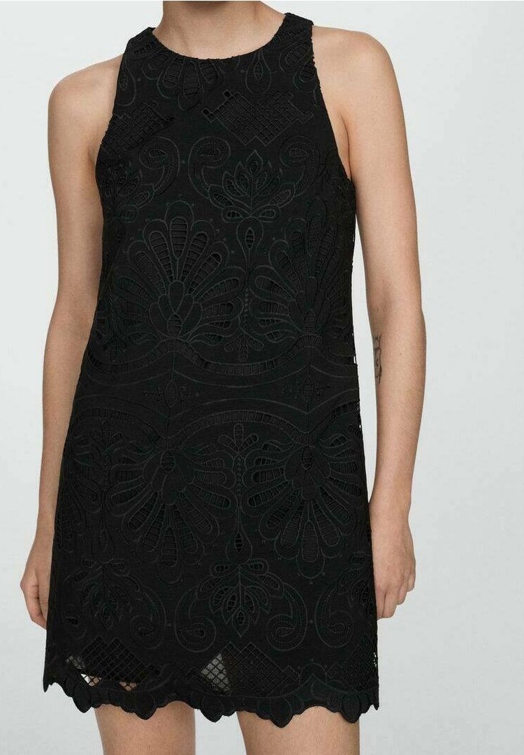 Robe noire sans manches avec un motif en dentelle complexe, un ourlet festonné et un col montant. Tissu texturé avec des détails floraux.