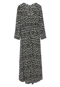 Robe midi noire et beige à motifs, avec manches longues en voile transparent et encolure à ouverture en goutte d'eau. Le tissu a une texture fluide ; présente une taille froncée.