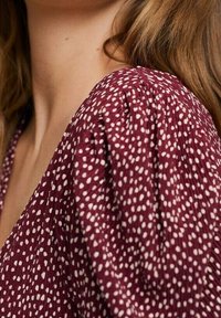 Robe bordeaux avec un petit motif floral blanc, décolleté en V, taille froncée et manches longues, dotée d'une fente sur le côté pour un détail supplémentaire.
