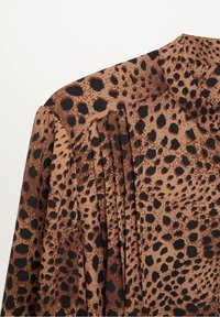 Femme portant une robe longue à manches longues marron avec des taches noires irrégulières, une taille cintrée avec une ceinture à nouer et un ourlet au niveau du genou.