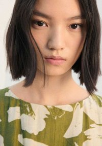 Robe à imprimé floral vert avec encolure bateau, design sans manches et jupe plissée. Chaussures noires à bouts ouverts complètent la tenue.