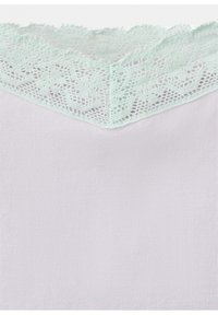 Jeune femme portant une robe nuisette violet clair avec une bordure en dentelle et des chaussures en tricot violet clair sans lacets, debout contre un mur uni.