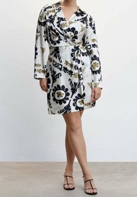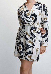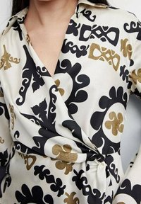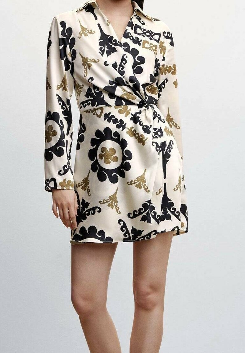 Robe patineuse à manches longues en tissu crème présentant un motif floral abstrait noir et or, avec un col et un détail de taille froncée.