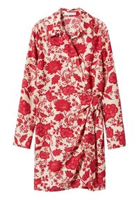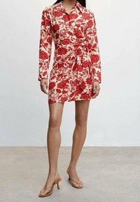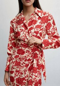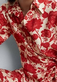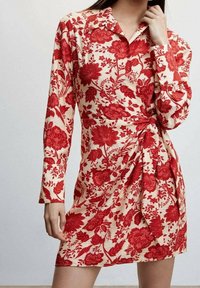 Femme portant une robe à manches longues et longueur genou avec des motifs floraux rouges sur fond beige, mettant en avant un détail de nœud sur le côté.