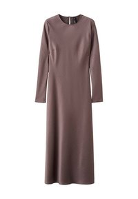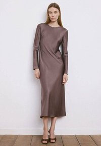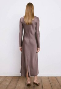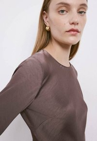Femme aux cheveux blonds raides portant une robe en satin mauve à manches longues, debout devant un fond clair uni.