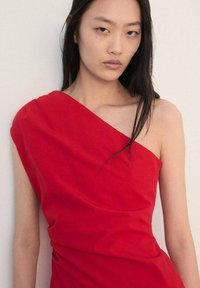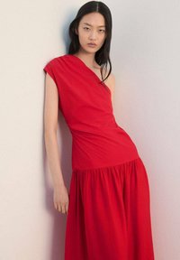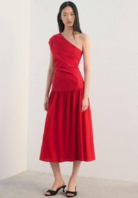 Femme portant une robe midi rouge à une épaule avec une jupe froncée, debout pieds nus sur un sol clair contre un mur blanc uni.