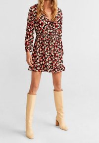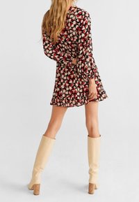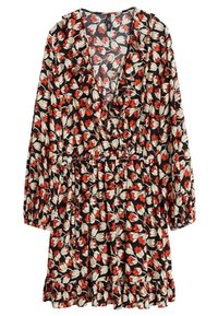 Femme portant une robe portefeuille à manches longues noire avec un imprimé floral rouge et beige et un ourlet à volants, ajustant la ceinture à la taille.