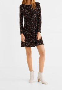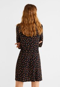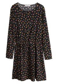 Femme portant une robe noire à manches longues avec un petit motif floral multicolore et une taille cintrée avec un cordon de serrage.