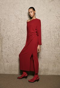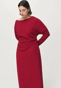 Femme aux cheveux courts et foncés portant une robe rouge à manches longues et longueur genou, avec un détail froncé sur un côté, assortie à des talons noirs pointus.