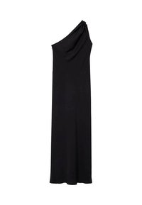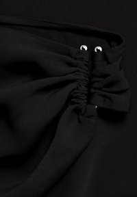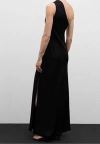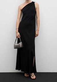 Femme portant une robe noire à une épaule avec des ornements en argent en forme de billes et de grandes boucles d'oreilles en argent, sur un fond blanc uni.